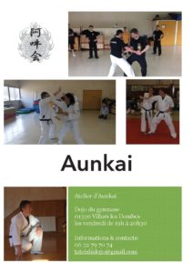 Cours hebdomadaire d'Aunkai. Au dojo du gymnase à Villars les Dombes. De 19h00 à 20h30. Renseignements au 06 32 79 70 74 / tateishidojo@gmail.com. Christophe étant parfois en déplacement pour animer un stage dans une autre ville, le cours du soirs peut être annulé. Pensez à vérifier la tenu du cours.